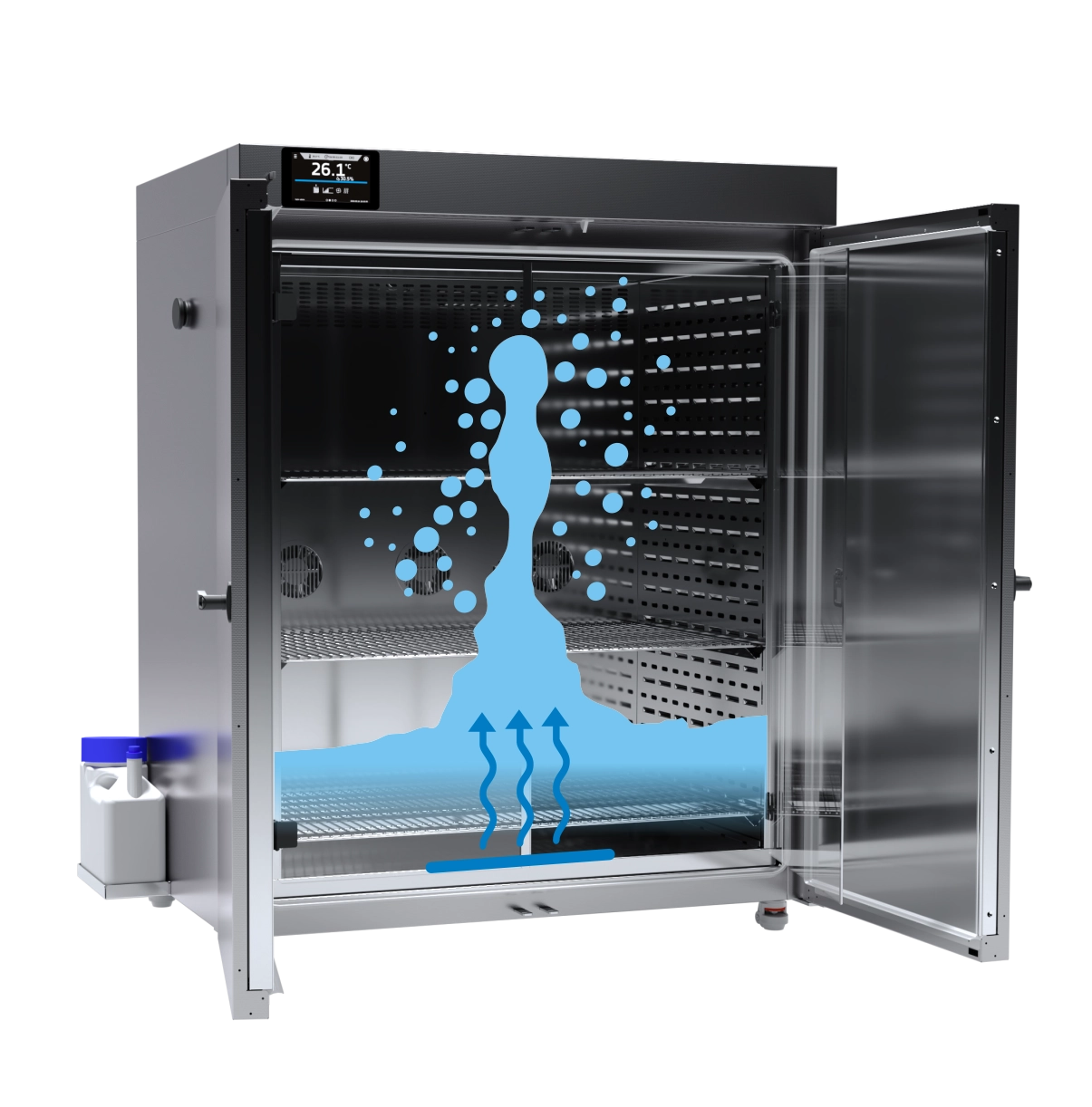 The KKP constant climatic chambers with a steam humidifier do not emit ultrasounds and therefore allow insects breeding (e.g. Drosophila melanogaster). Compared to the KK chambers, they feature an extended temperature and humidity range and can be used for tests of electronics, plastic or building materials.